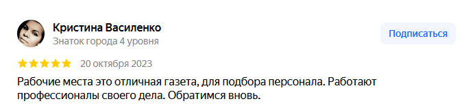 Мне очень нравится с Вами работать, всегда быстро, просто и реклама работает на все 100 %.Так же очень вежливый и отзывчивый персонал, подскажут и помогут. Поэтому каждый раз, когда нам требуются новые сотрудники, Вы узнаете об этом первые! Молодцы! Так держать!