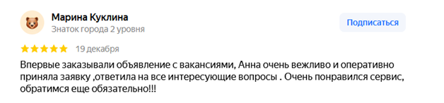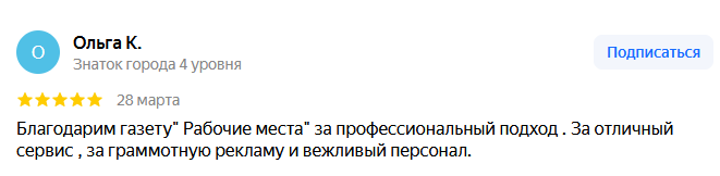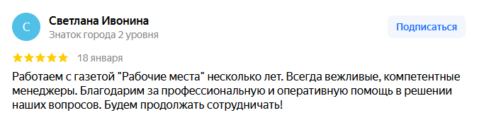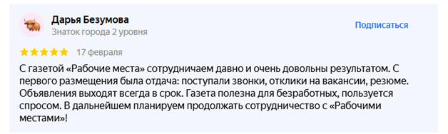 Приятно, что наши вакансии соискатели параллельно видят на сайте газеты, и это не требует дополнительных затрат. Спасибо за профессиональное сотрудничество!