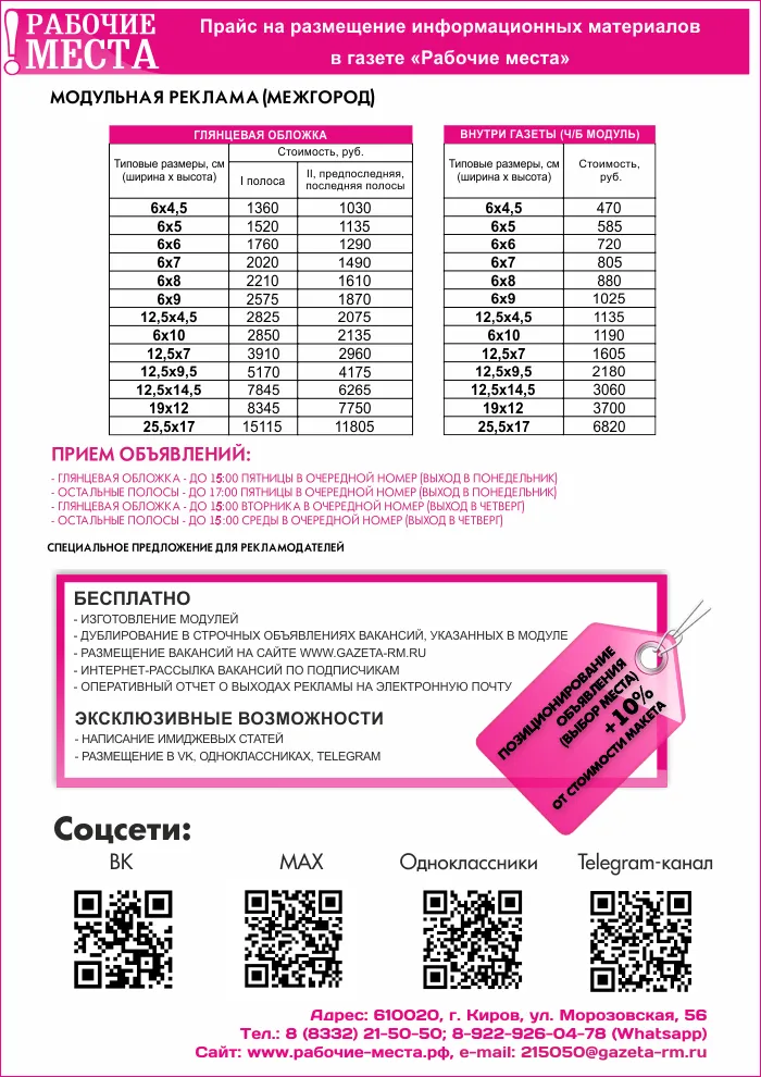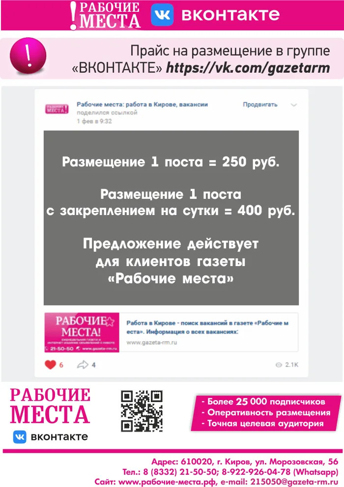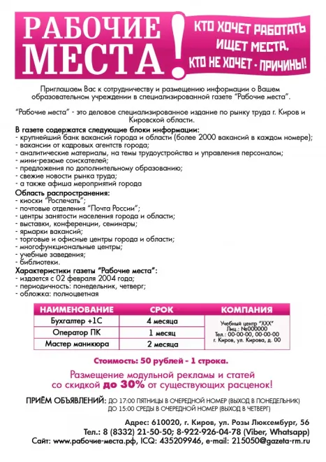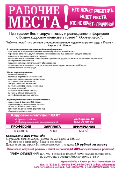 Вакансии в газете «Рабочие места» размещаем еженедельно (ООО ЕЛЛОУ ПЕЙДЖЕС ТЕЛЕКОМ открывает новый офис в Кирове и создает в связи с этим более 300 рабочих мест). Издание достаточно информативно. Для нас основные критерии – это большой тираж газеты и охват необходимой нам аудитории. Удобство в работе, т.е. это возможность узнавать о новых вакансиях города, как в печатном издании, так и на сайте https://www.gazeta-rm.ru/.