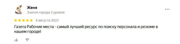 Все в г. Киров знают, что если ты в поиске работы, надежный помощник - газета «Рабочие места». И для нас, как работодателя – это неоспоримый плюс! Благодарны газете «Рабочие места» и ее сотрудникам – за своевременность, оперативность, эффективность, индивидуальный подход! Успехов!